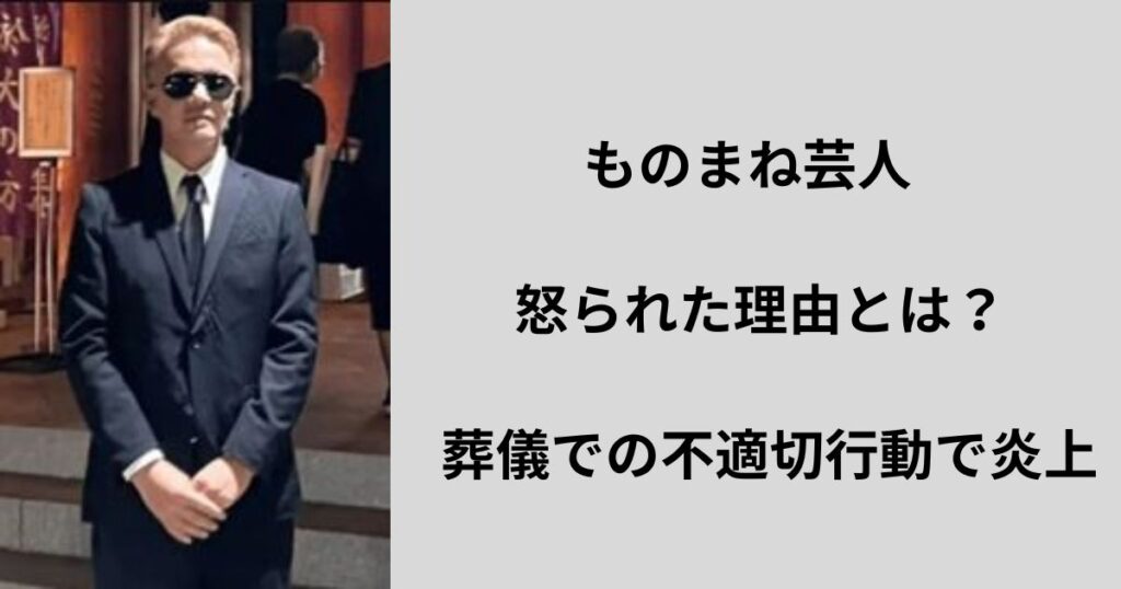 ものまね芸人の不適切な行動が大きな波紋を呼んでいます。 今回は、ある葬儀での出来事がきっかけとなり、ものまね芸人が批判を浴びることになった経緯や、それに対する芸能界からの反応をお伝えします。 なぜものまね芸人が怒られることになったのか? そ... -
